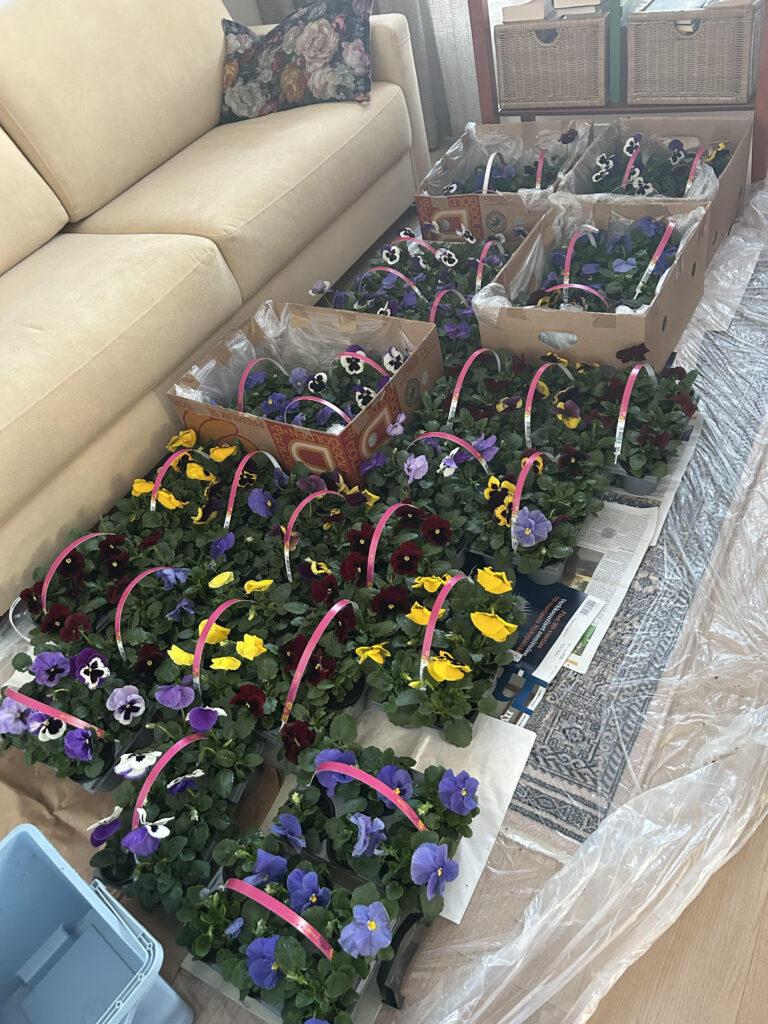 Valmistautumista Satamamarkkinoille 25.4. Tervetuloa Kokoomuksen teltalle. Meitä on siellä orvokkien lisäksi muitakin. Kunnallisjärjestön puheenjohtajan tehtäviin kuuluu näköjään myös orvokkien hoitaminen 🙂